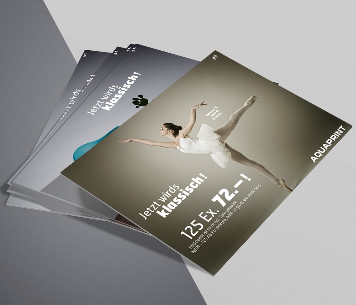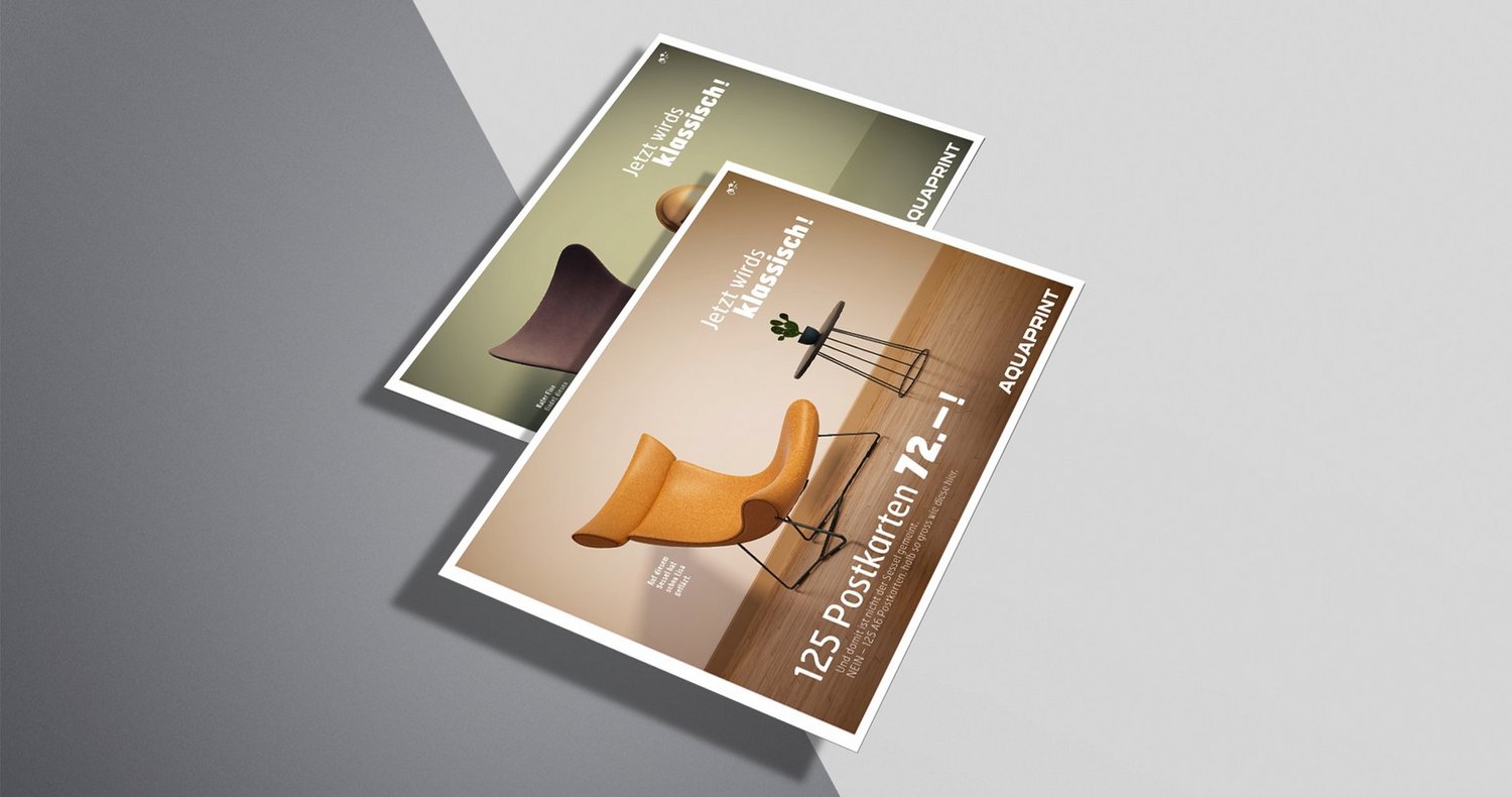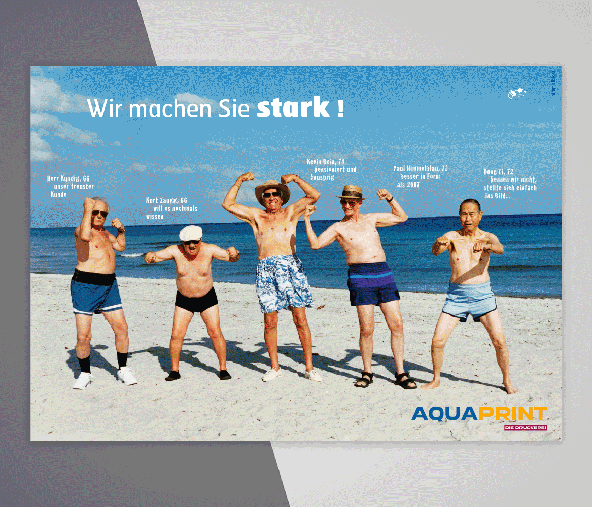 Aquaprint war die erste Druckerei, die Postkarten in grossen Mengen druckte. DIE Postkartendruckerei. Himmelblau verantwortete die Werbung und setzte sie mit Humor um. Die Zusammenarbeit begann Mitte der 1990er Jahre und endete 20 Jahre danach mit dem Verkauf der Druckerei.