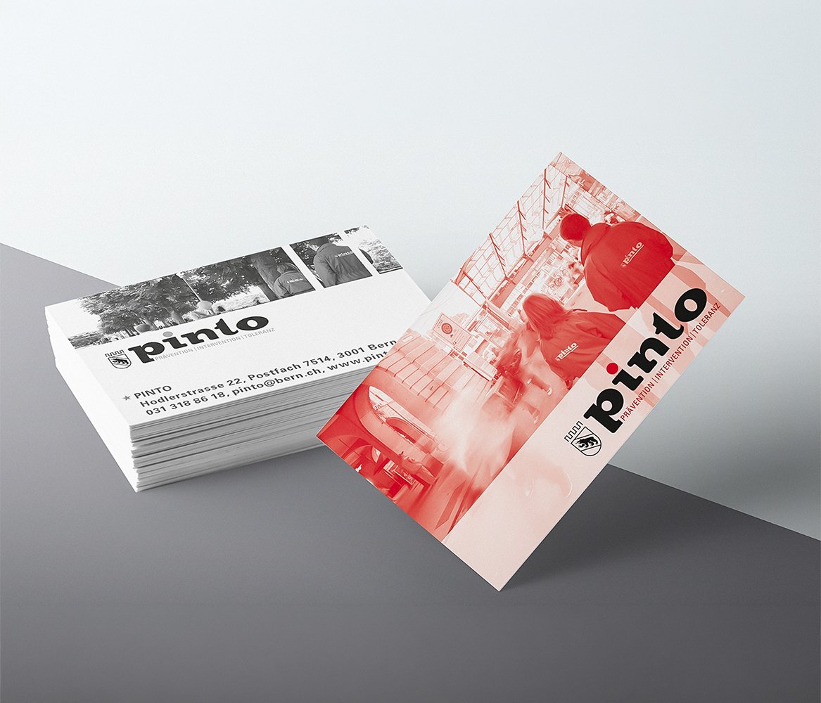 Für PINTO, ein Angebot der Stadt Bern, hat Himmelblau das Logo gestaltet und damit die visuelle Grundlage für den Auftritt geschaffen. Darauf aufbauend entstanden erste Workwear sowie Angebots- und Infobroschüren, die das Angebot von PINTO klar und wiedererkennbar nach aussen tragen. Der Auftritt unterstützt dabei eine wichtige Aufgabe im öffentlichen Raum: Präsenz zeigen, Orientierung geben und Vertrauen schaffen.