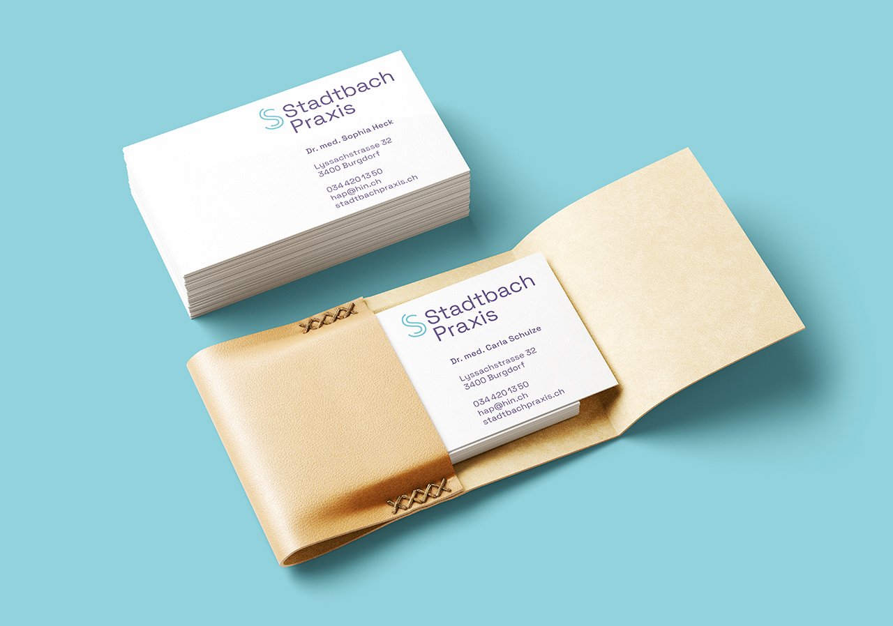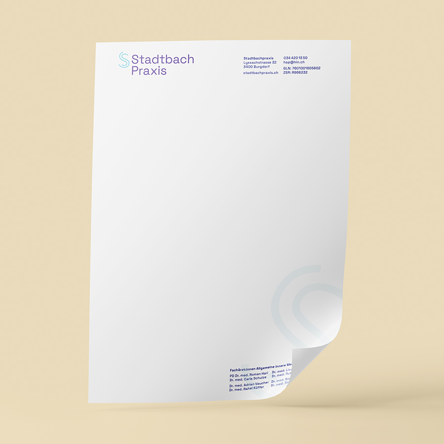 Das zeitlose Branding für die Stadtbach Praxis ist elegant und weist Symbolkraft auf. Das Monogramm deutet auf den Stadbach und zeigt zugleicht, dass es in der Praxis «rund» läuft und die Patientenfrequenz flüssig bewältigt wird. Dazu gesellt ein Corporate Design, welches die Reduktion und das minimalistische Design betonen.