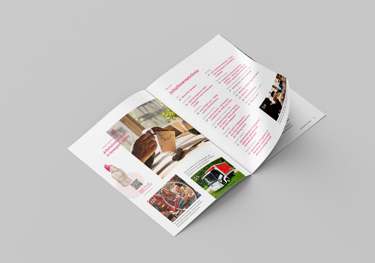 Für die Stiftung Intact in Burgdorf entstehen mit Himmelblau Jahresberichte, Angebotsfolder, Leporellos und Kampagnen. Damit tragen wir ihr Engagement klar und stimmig nach aussen. Die wertvolle Arbeit der Stiftung Intact schätzen wir sehr und unterstützen sie mit Überzeugung.